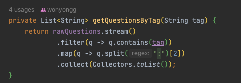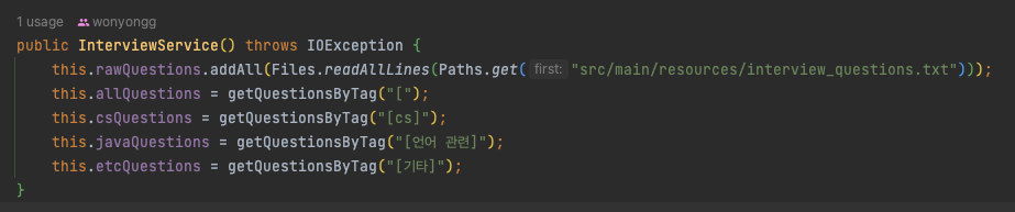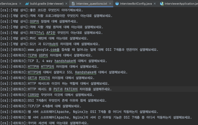 현재 코드는 Text 파일을 읽어 콜론(:)을 기준으로 [대 카테고리][소 카테고리][질문 내용]으로 배열에 저장할 수 있게 만들고, 질문 내용만 각 질문 객체 배열에 나눠 담는 방식을 사용하고 있다. 그러나, text 파일을 데이터베이스로 이용하는 방식은 보기에도 불편할뿐더러 데이터를 추가하는 작업 역시 힘들다. 구글 스프레드 시트나 노션의 데이터베이스에 저장하고 바로 가져오는 방식으로 변경할 예정이다.