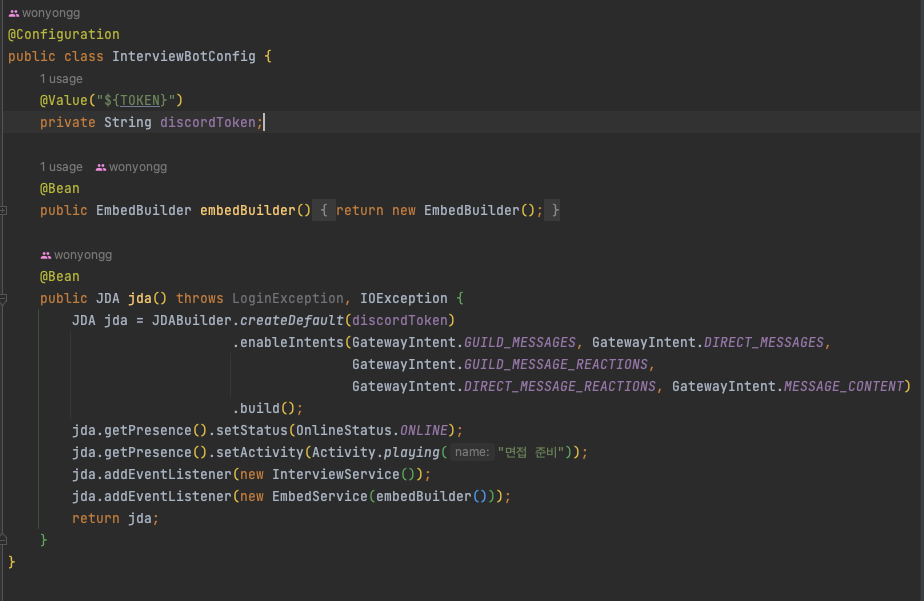 configuration과 서비스 계층을 분리하여 설계했다. EmbedService는 디스코드 봇 초대 시에 받을 수 있는 메시지를 설정할 수 있고, InterviewService는 인터뷰 질문과 관련된 로직이 들어있다.