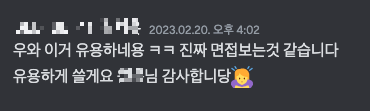 여러 동기분들에게 공유하고 좋은 반응을 받았다. 비록 간단한 프로그램이지만 다들 내가 만든 프로그램을 다수가 만족하며 사용하고 있다는 사실이 매우 기뻤다. 나 역시 현재 기술 면접 대비를 위해 매일 사용중이다. 작은 시작이지만 개발에 대해 큰 재미를 느낀 순간이었다.