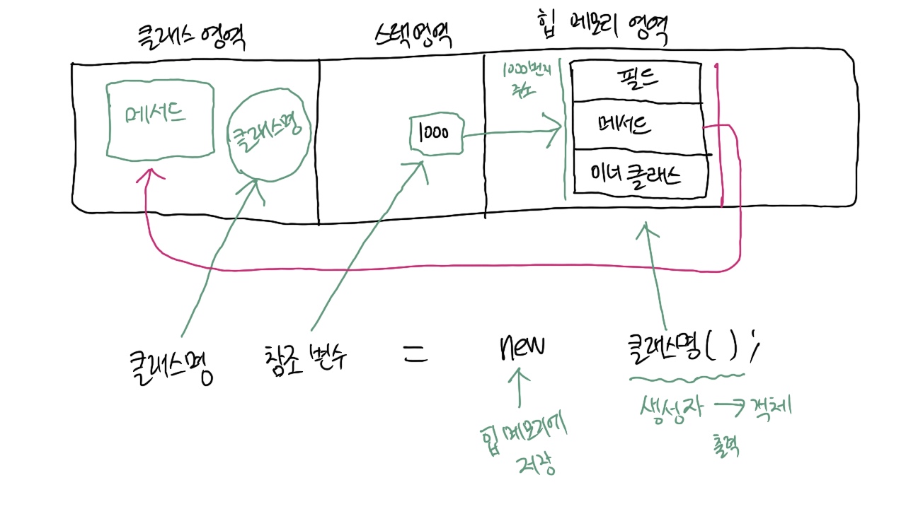 먼저 특정 클래스 타입의 참조 변수를 선언하고, new 키워드와 생성자를 통해 인스턴스(객체)를 생성하여 참조 변수에 할당한다. 참조 변수는 실제 데이터가 저장되어 있는 힙 메모리의 주소 값을 가리킨다. new 키워드는 생성자가 객체를 만들면 이를 힙 메모리에 넣는 역할을 수행한다.