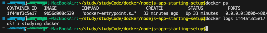 - 아니면 docker logs라는 명령어로 컨테이너에 의해 출력된 로그 목록을 볼 수 있다.