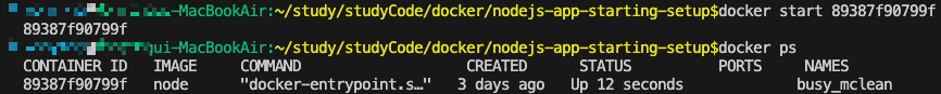 - docker ps -a 명령어로 종료된 컨테이너의 id나 이름을 확인한 후 docker start로 종료된 컨테이너를 재시작할 수 있다.