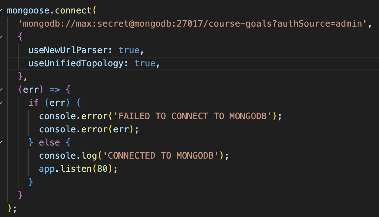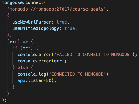 - 네트워크 통신을 위해 --network 플래그를 사용했기 때문에 'host.docker.internal' 대신 'mongodb'라는 mongoDB의 컨테이너 이름으로 설정하면 된다.