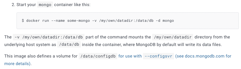 - mongoDB의 공식 이미지를 보니 컨테이너 안의 mongoDB의 경우 기본값으로 /data/db 경로에 데이터가 저장되는 듯하다.