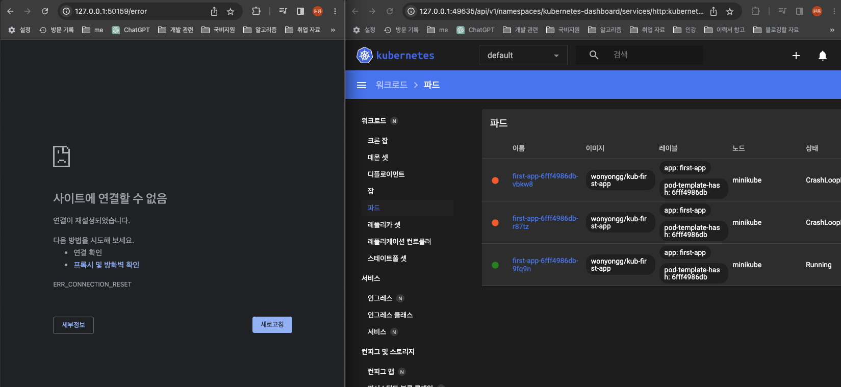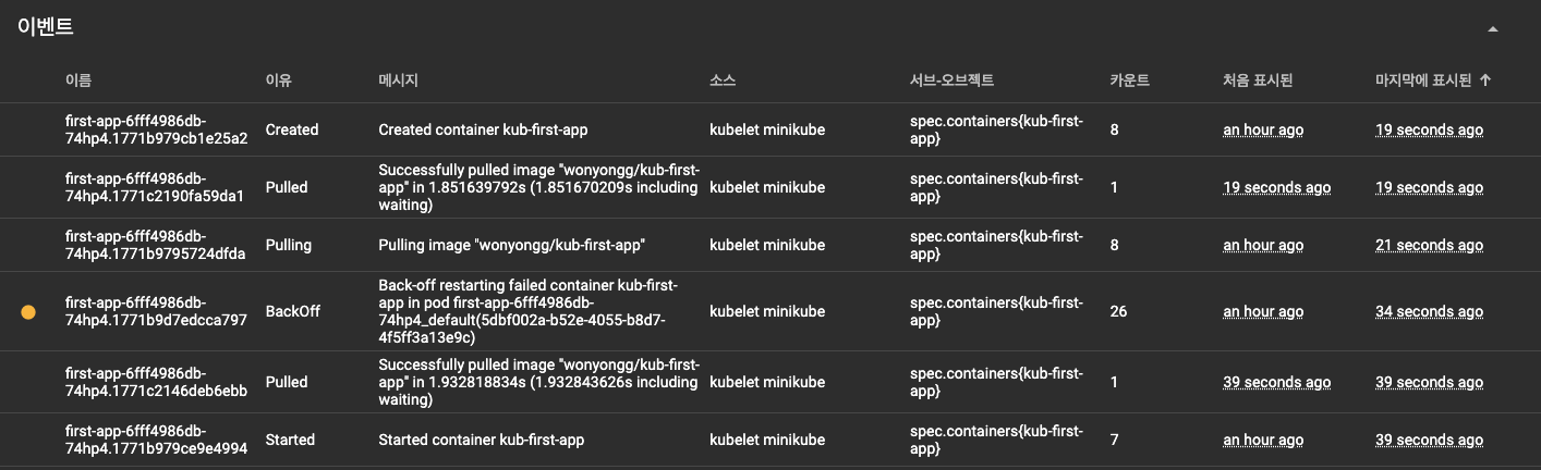 - minikube dashboard에 들어가 이벤트를 확인해 보면 에러가 발생한 후 이미지를 도커허브에서 다시 당겨와 컨테이너를 만들고 실행하는 부분까지 스스로 작동하고 있음을 확인할 수 있다.