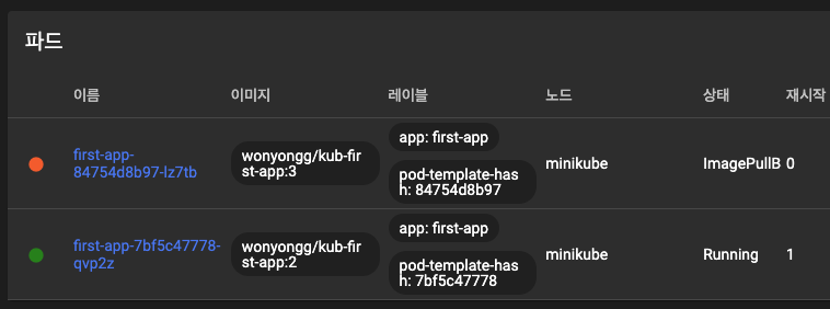 - Minikube dashboard에서 파드를 확인해 보니 2로 설정한 이전 태그의 이미지는 작동 중이고