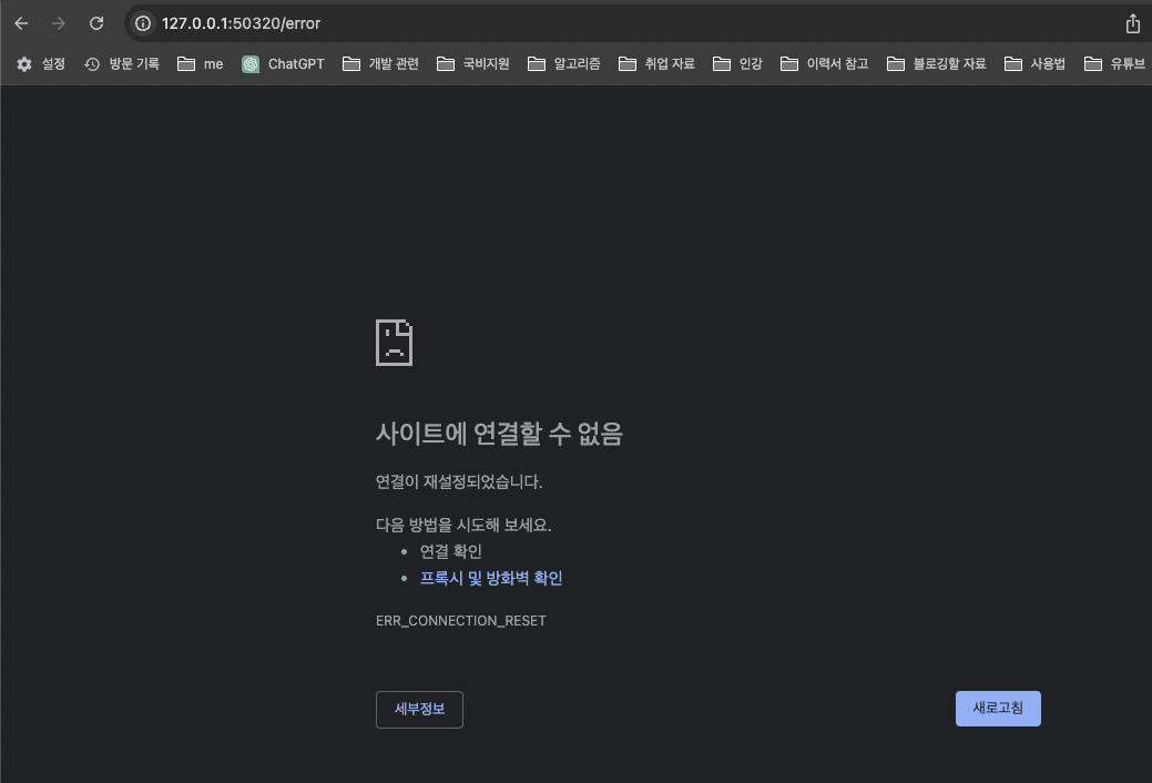 - /error라는 url로 접속하니 서버가 다운되었다.