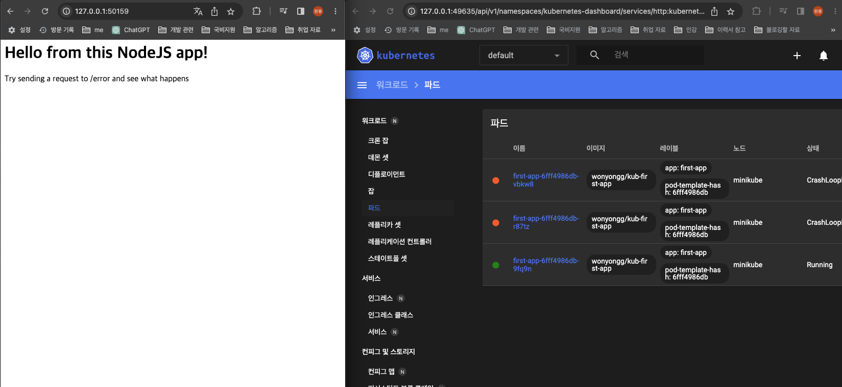 - 의도적으로 서버를 다운시킨 후 몇 초 간격으로 계속 pods의 상태를 모니터링하자 STATUS가 Error였다가 새롭게 Running으로 바뀌는 것을 확인할 수 있었다.