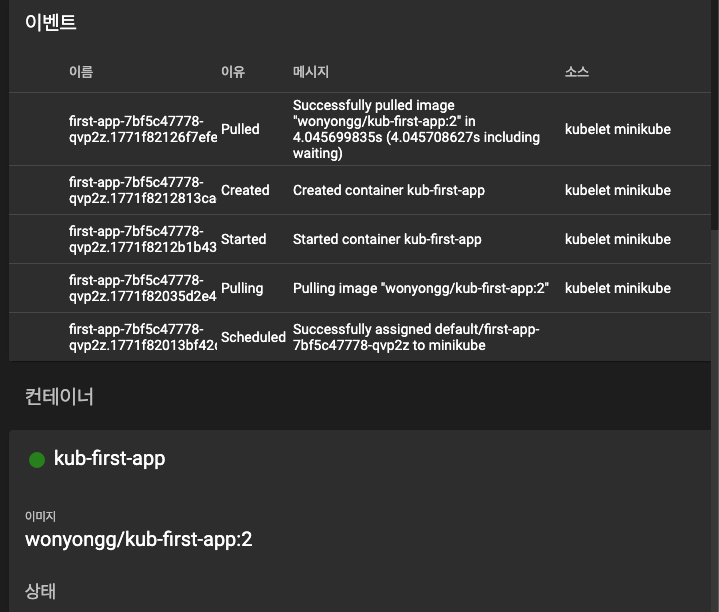 - Minikube dashboard에서도 태그 2의 이미지를 docker hub에서 당겨와 컨테이너를 실행했음이 기록되어 있다.