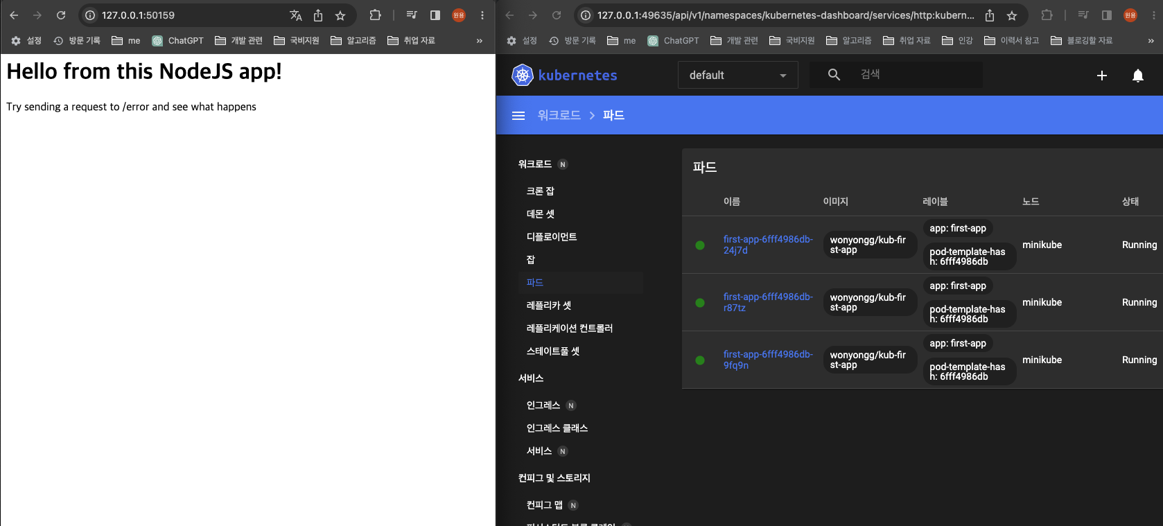- minikube dashboard를 통해서도 파드가 세 개 정상적으로 Running 상태임을 확인할 수 있다.