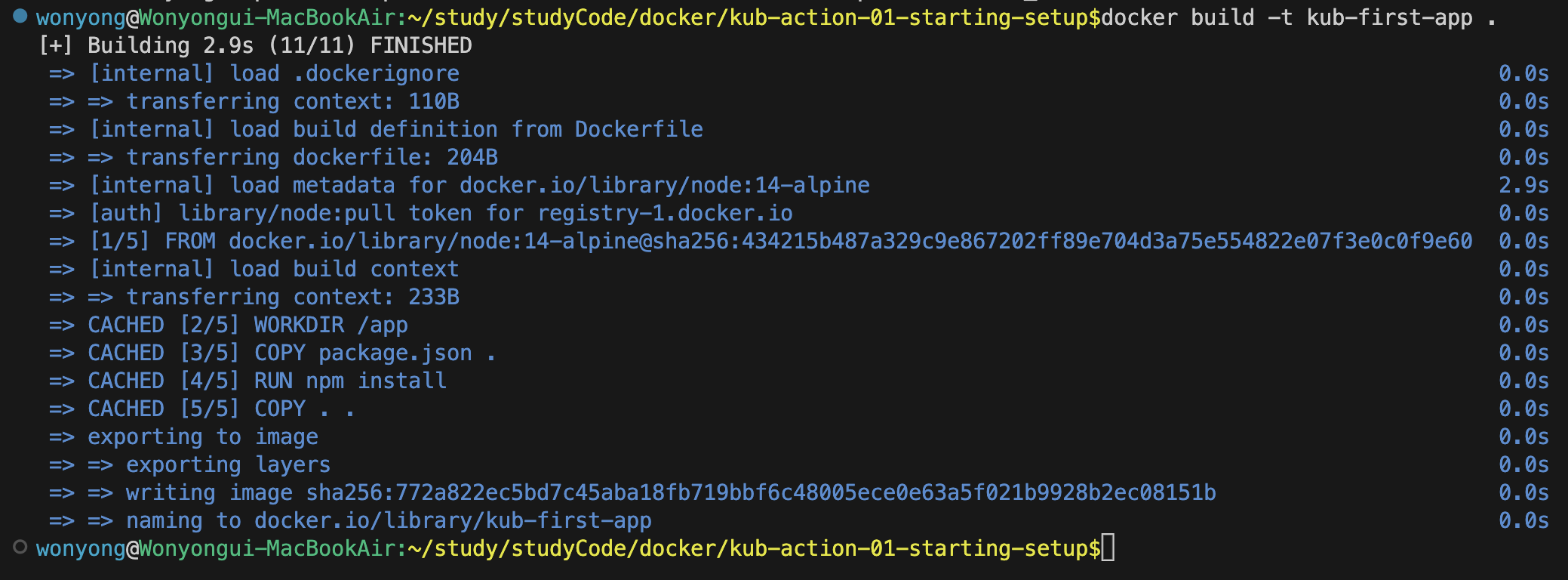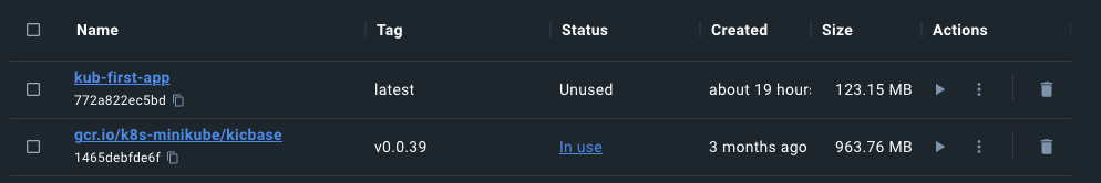 - 도커 데스크탑의 image를 확인해보면 맨 위에는 직접 빌드한 kub-first-app이 보이고, 두 번째로는 minikube의 이미지가 보인다.