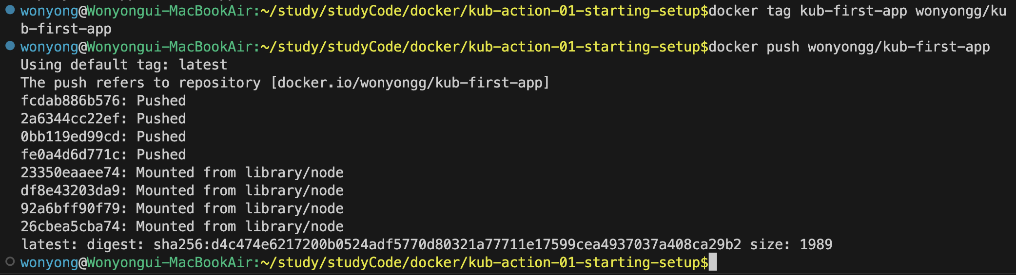 - 로컬 이미지를 컨테이너 안의 가상 클러스터 안에서도 다룰 수 있도록 도커 허브의 레파지토리에 업로드한다.
