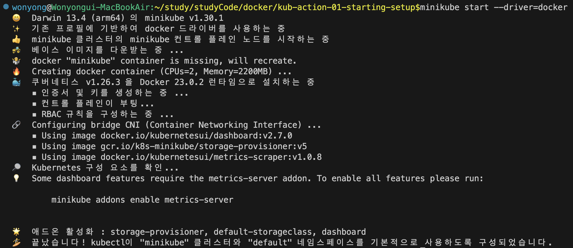 - 위 명령어를 실행하니 minikube가 도커를 사용하여 가상 환경을 생성했다.