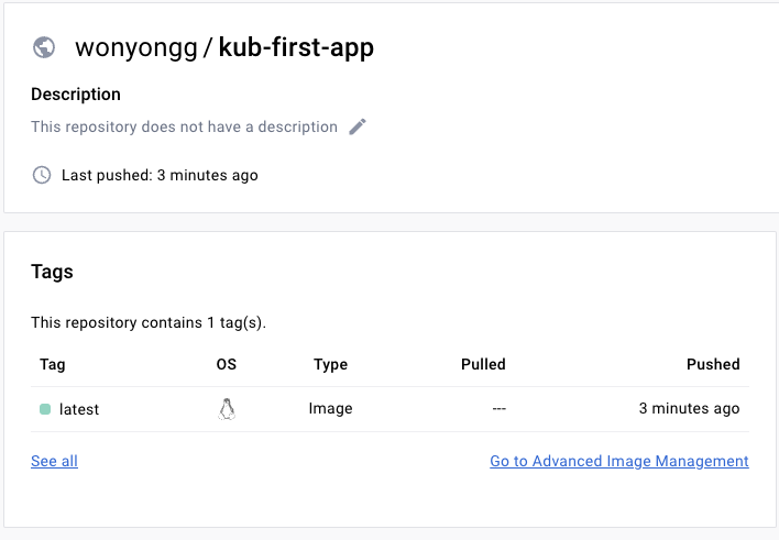 - --image에 도커 아이디와 함께 허브의 레파지토리 명을 정확하게 써주었더니