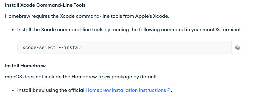 - 설치방법을 확인해 보니 Xcode 명령어나 Homebrew를 이용하여 다운로드할 수 있다고 나온다.