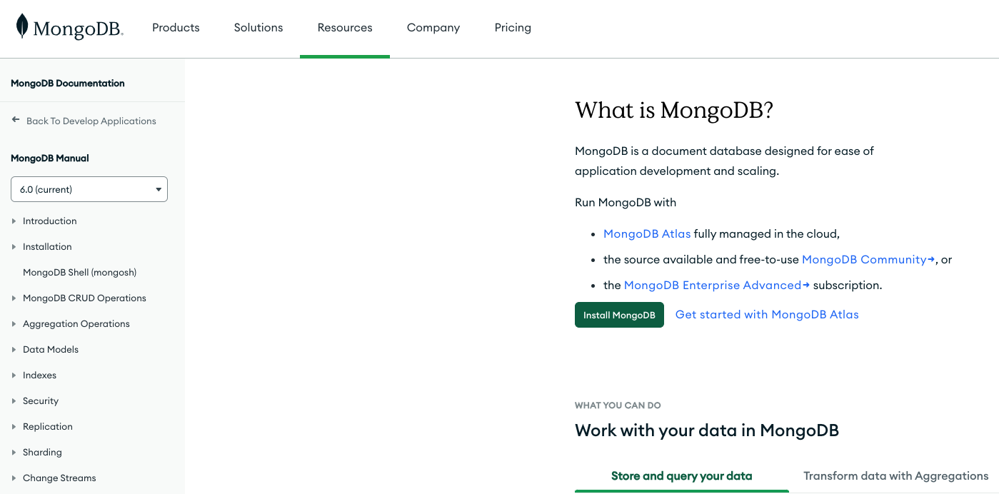- 구글에 "mongodb 공식 문서"라고 검색하면 공식문서 웹사이트가 나온다.