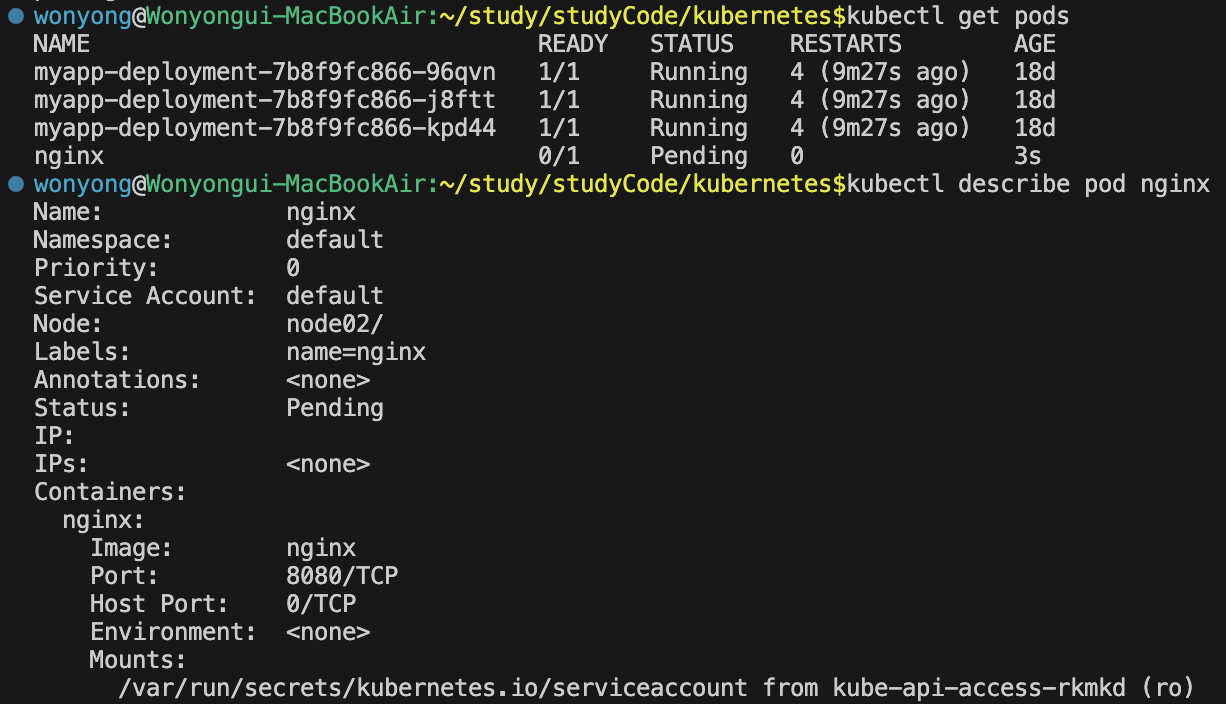 - kubectl apply 명령어로 수정한 YAML 파일을 실행하니 ContainerCreating 상태에서 Running으로 변경되었으며 Node 역시 설정한 노드(m02)로 지정되었음을 확인할 수 있다.