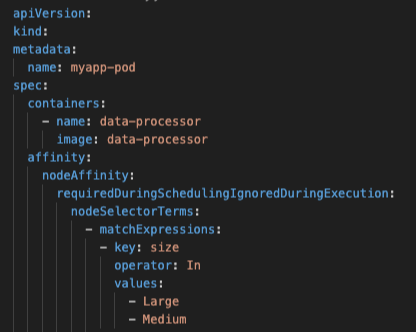 - 예를 들어 size: ["small", "medium"]라는 레이블이 있는 노드에 파드를 스케줄링하고자 할 때 operator: In을 사용하면 size의 값이 "small" 또는 "medium"인 노드에만 파드를 할당할 수 있다.