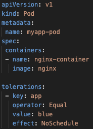 - "Equal" 연산자 (=): Tolerations의 키-값 쌍과 노드의 Taint의 키-값 쌍이 정확히 일치하는 경우에만 파드를 해당 노드에 스케줄링한다.