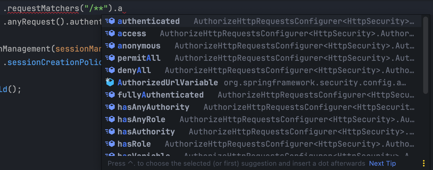 - 예를 들면 permitAll은 해당 경로는 누구나 접근 가능하다. demyAll은 누구도 접근할 수 없다. 뭐 그런 거겠죠?