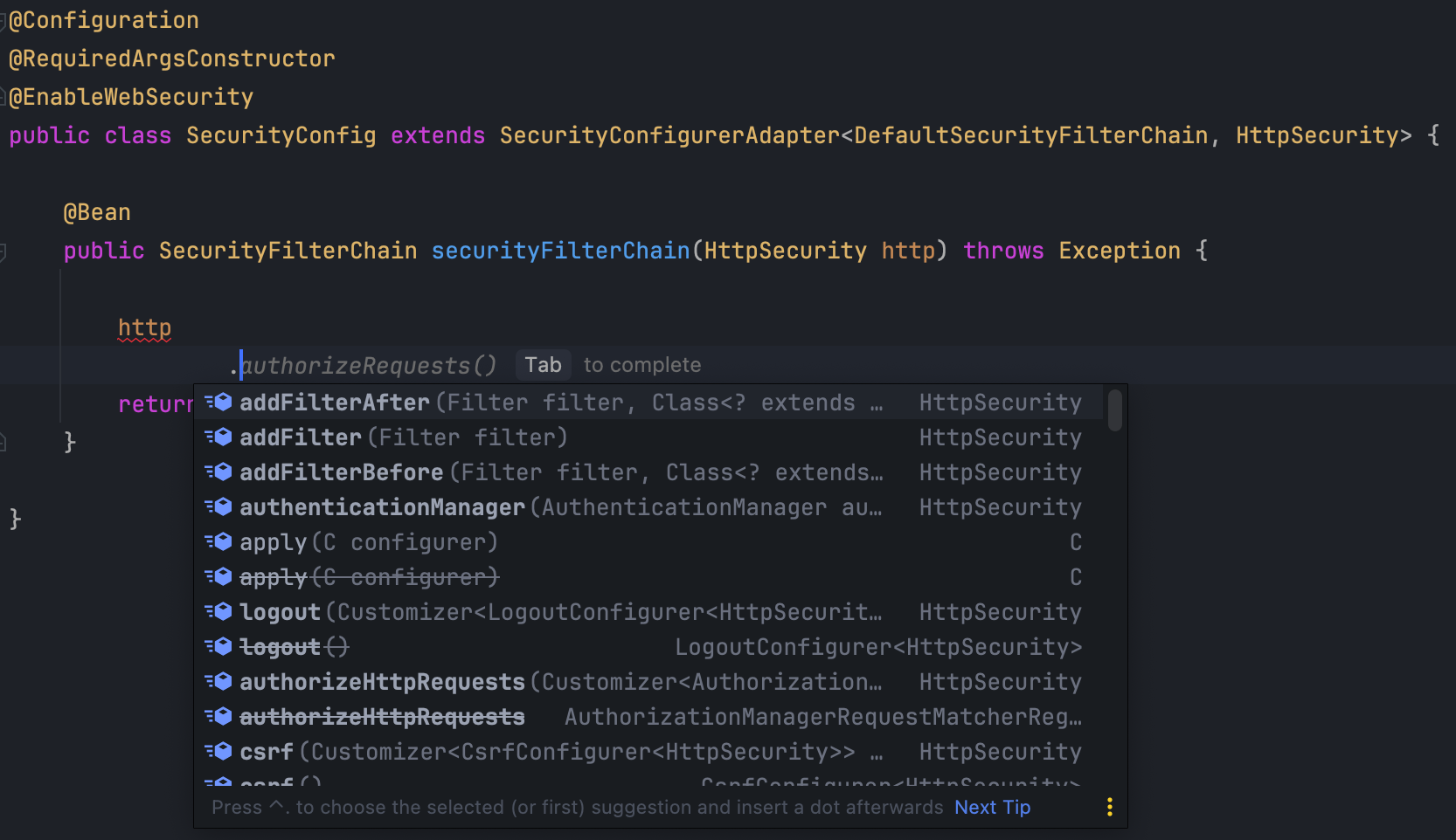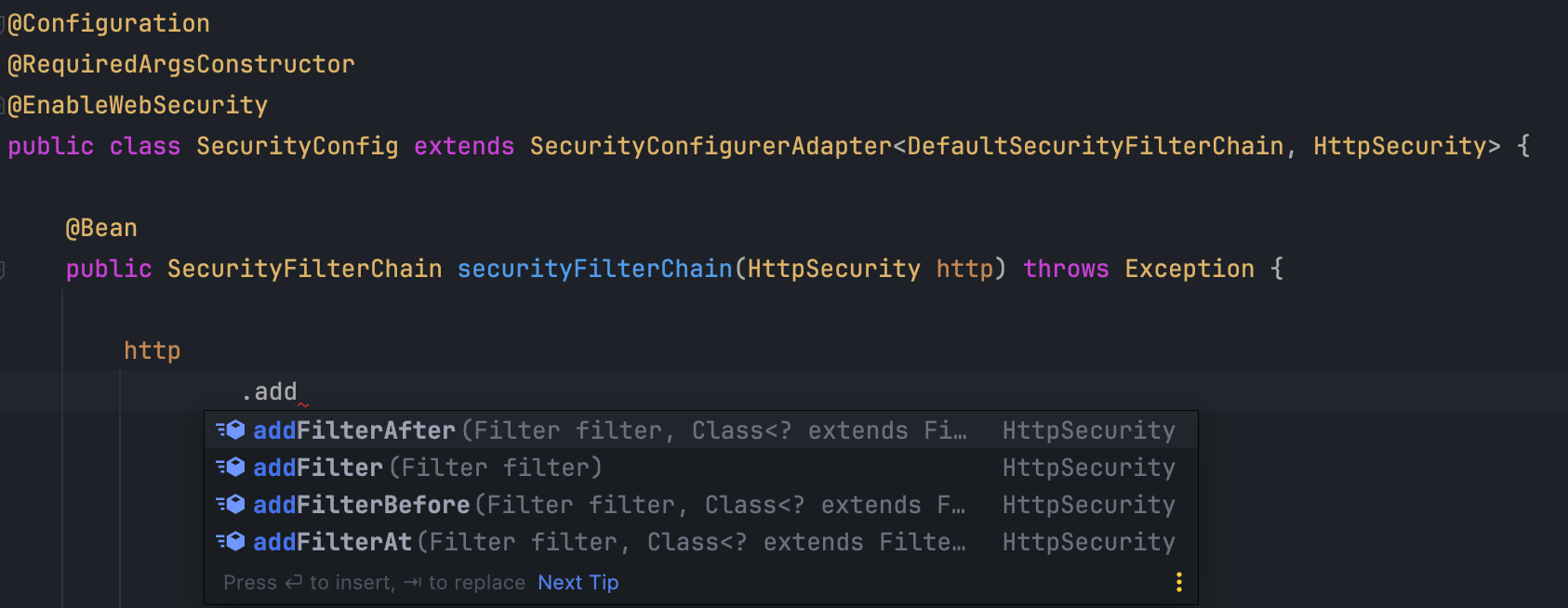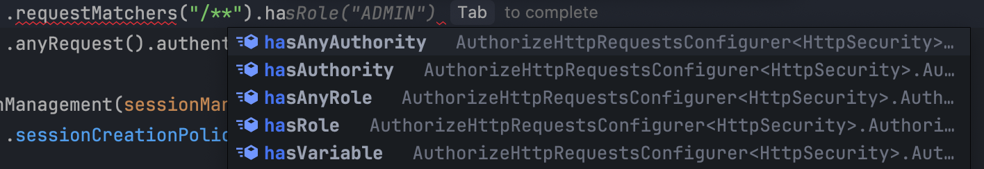 - 위 사진과 같이 HttpSecurity를 이용하여 각종 설정을 추가할 수 있습니다.