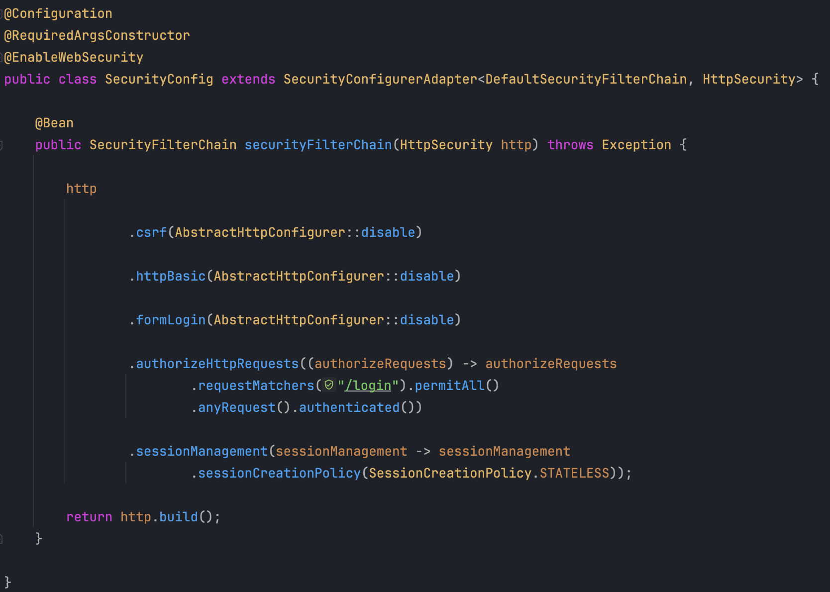 - 여기에서는 JWT 토큰 인증 방식을 사용할 것이므로 해당 공격에 대한 방어가 필요 없어 설정을 비활성화하는 것입니다.