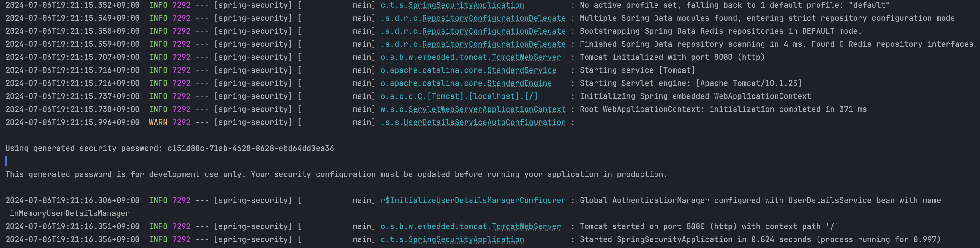 - 스프링 시큐리티가 적용되어 기본적으로 사용될 비밀번호가 생성되었음을 확인할 수 있습니다.