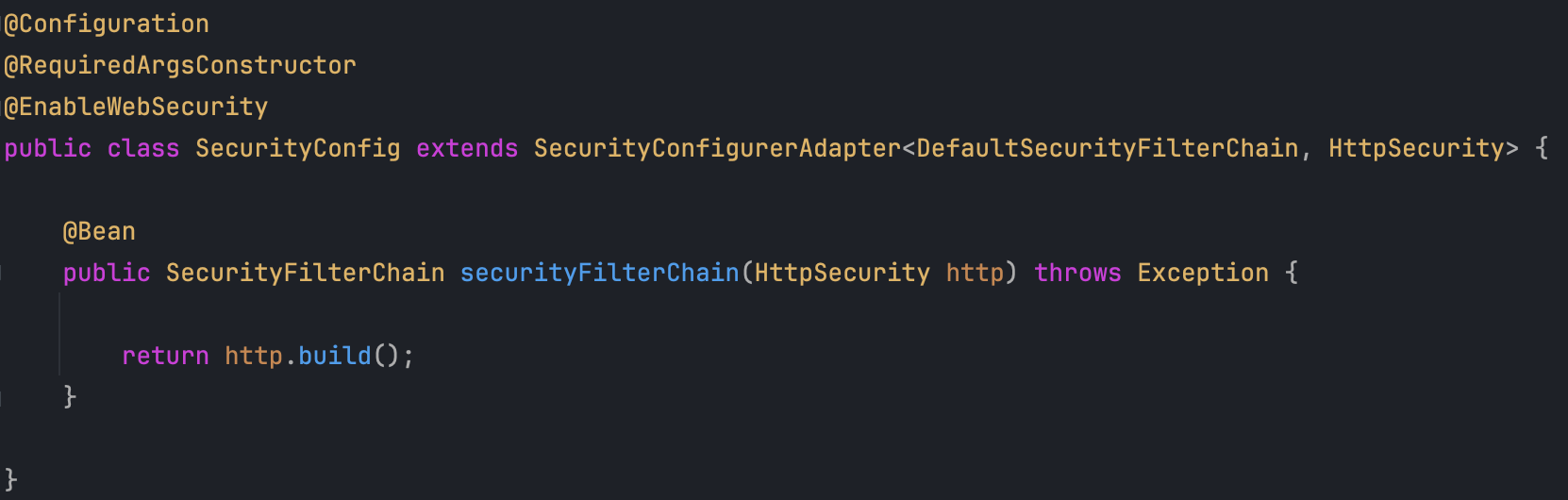 - 제네릭 타입 <DefaultSecurityFilterChain, HttpSecurity>는 설정할 시큐리티 필터 체인과 설정 객체를 지정합니다.
