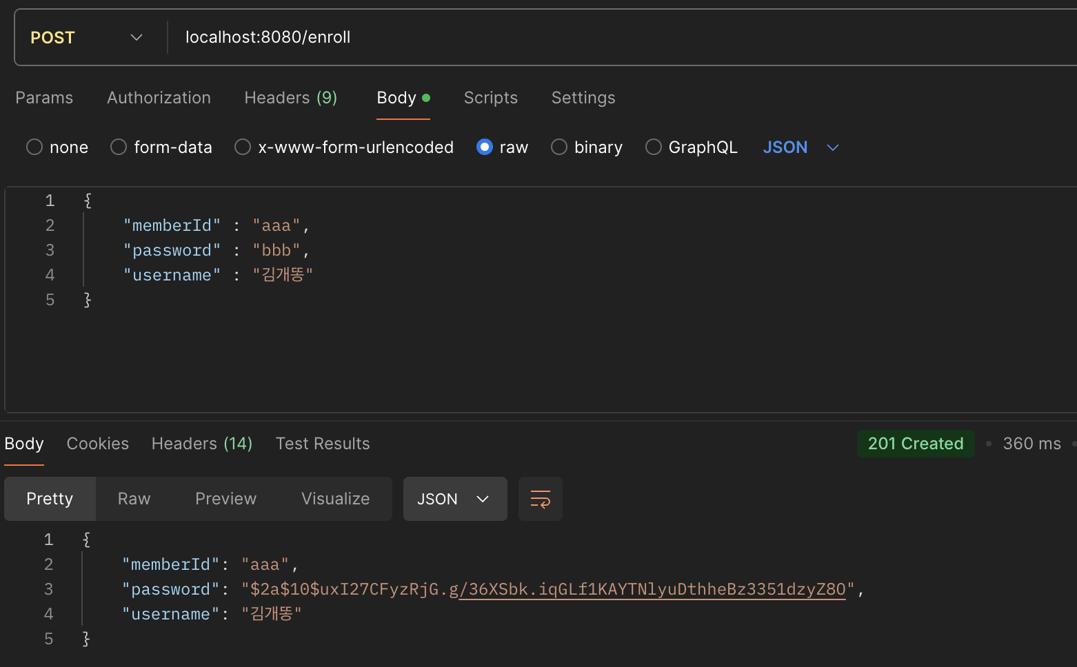 - 이전에는 password가 "bbb"와 같이 평문 그대로 저장되었는데 해시 암호화되어 저장됨을 확인할 수 있습니다.