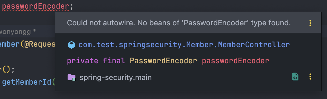 - 또한, 생성자메서드의 파라미터로 PasswordEncoder가 필요해 보입니다.