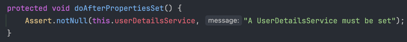 - doAfterPropertiesSet이라는 메서드 이름을 보니 properties 세팅이 끝난 후 자동으로 실행되는 메서드인 것 같은데 UserDetailsService를 주입받지 않으면 A UserDetailsService must be set이라는 경고 문구를 던지는 것으로 보아 아까 위에서 본 에러 메시지에 해당하는 메서드임을 알 수 있습니다.