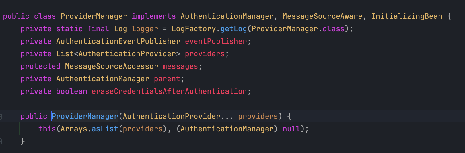 - 해당 클래스 내부에 들어가면 위와 같이 생성자 메서드에 파라미터로 AuthenticationProvider의 구현체를 받고 있음을 확인할 수 있습니다.