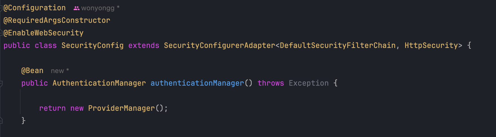 - 따라서 저희는 Confing 내의 ProviderManager의 파라미터에 AuthenticationProvider를 주입할 것입니다.