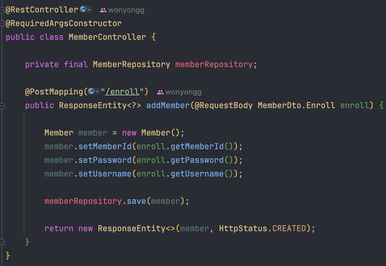 - 이전 시간에 만들었던 회원 가입 컨트롤러로 돌아가봅니다.