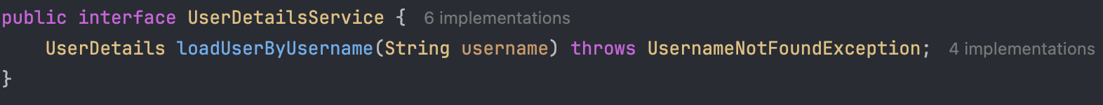 - UserDetailsService의 loadUserByUsername 메서드를 보아 짐작할 수 있는 것은 데이터베이스에 사용자의 username(id)를 넘기면 해당 username으로 사용자 정보를 찾아 UserDetails의 구현체로 리턴하라는 것입니다.