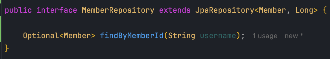 - 이를 위해 MemberRepository에 username(id)으로 Member를 조회하는 메서드를 추가합니다.
