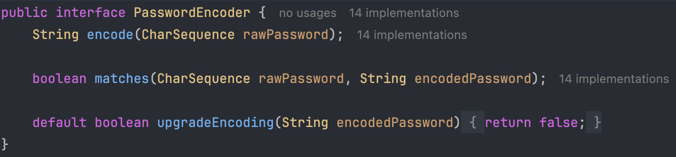 - PasswordEncoder의 메서드 명을 보니 패스워드를 인코딩(암호화)하는 메서드인 encode와, 로그인 시 입력받은 패스워드와 저장되어 있는(암호화된) 패스워드를 비교하여 맞는지 틀린 지 확인하는 matches라는 메서드가 있음을 직관적으로 알 수 있네요.