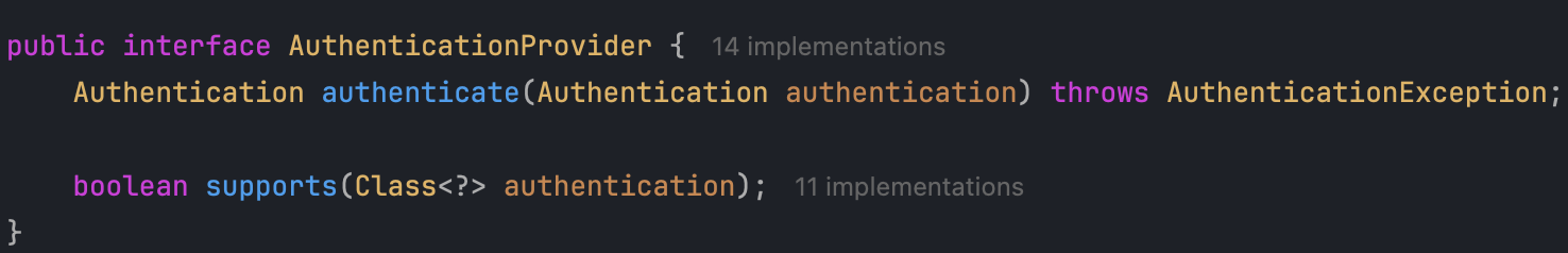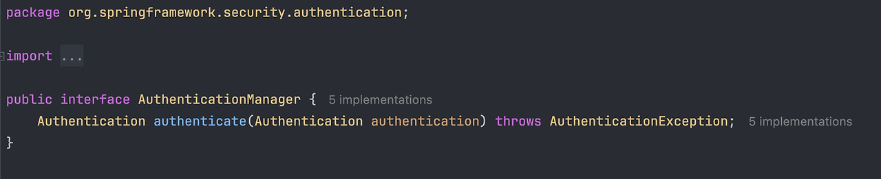 - AuthenticationManager를 살펴보면 인터페이스임을 확인할 수 있습니다.