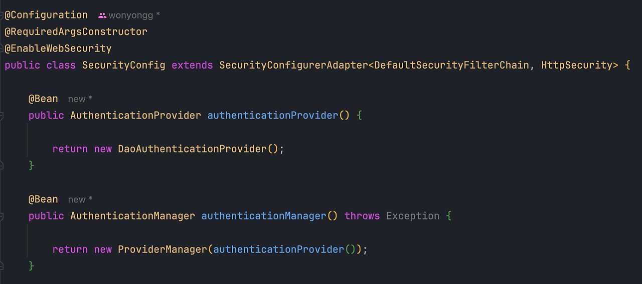 - 위와 같이 DaoAuthenticationProvider를 리턴하는 AuthenticationProvider를 스프링 빈으로 등록하고 ProviderManager의 파라미터에 싣습니다.