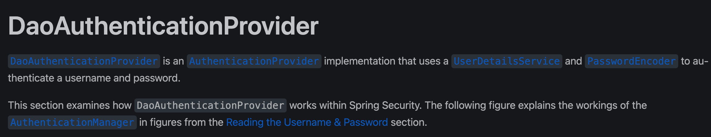 - 공식문서에 보면 DaoAuthenticationProvider는 UserDetailService와 PasswordEncoder를 이용하여 username(Id)와 password를 검증한다고 나와있습니다.