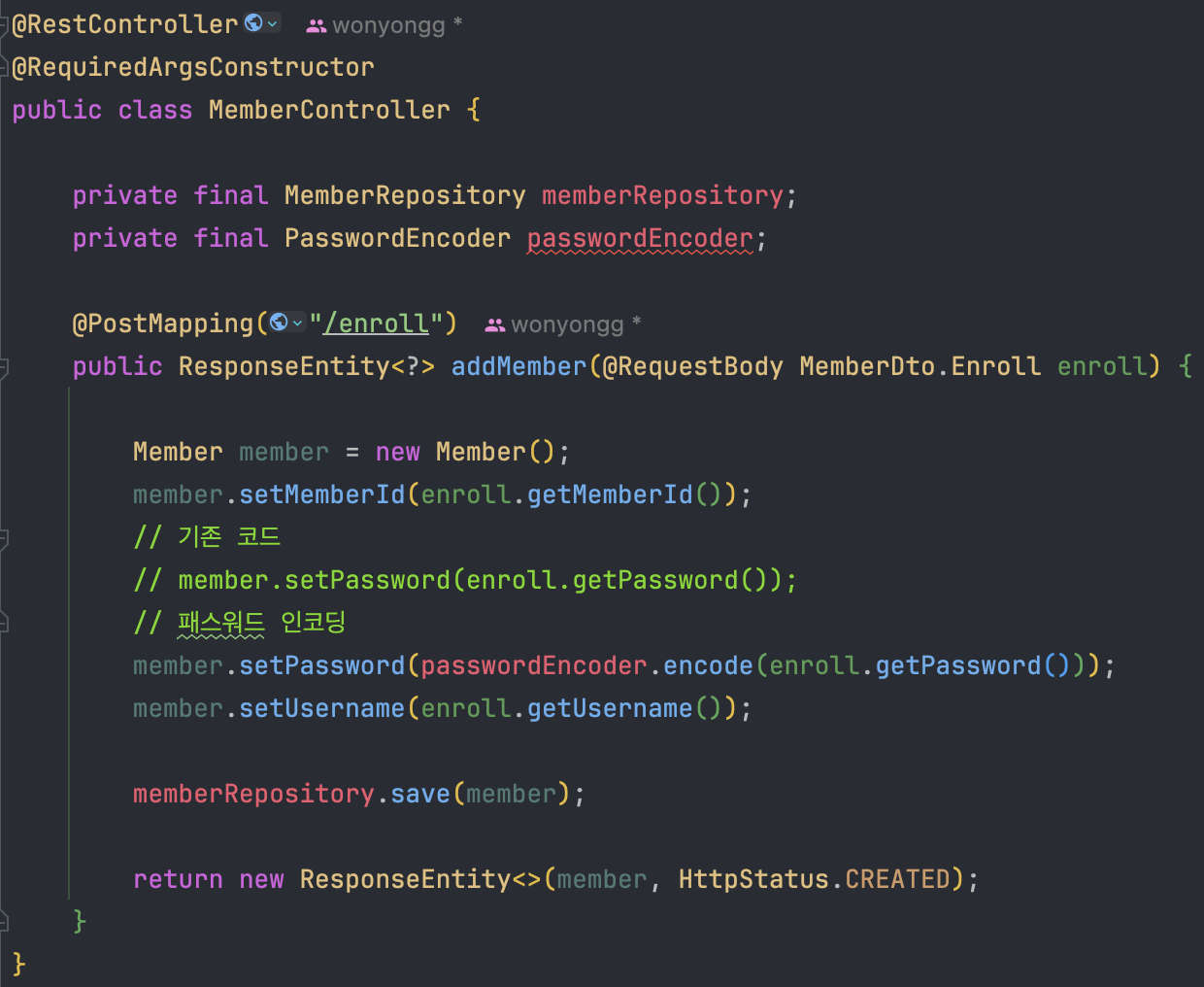 - 기존 코드를 지우고 PasswordEncoder를 의존성 주입받아 인코딩 후 저장하도록 변경합니다.