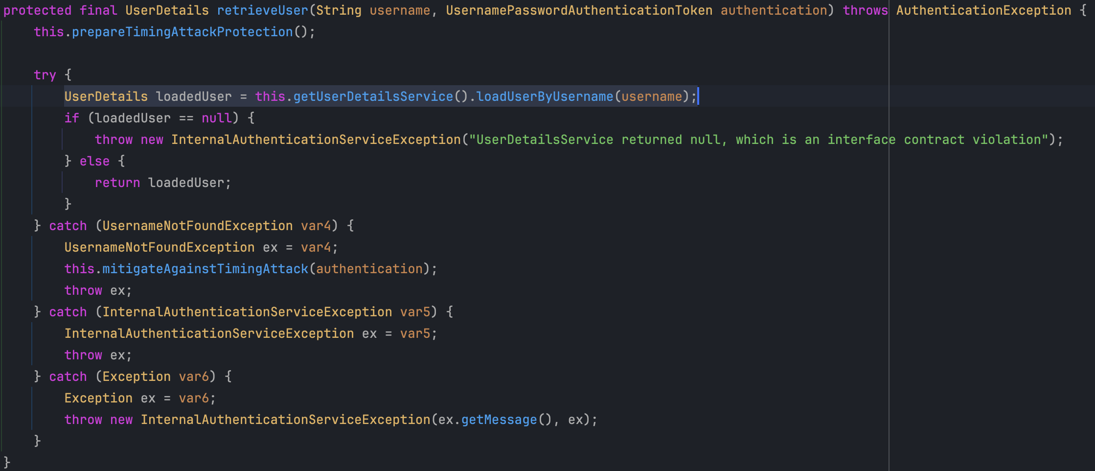 - DaoAuthenticationProvider 클래스의 retrieveUser 메서드를 살펴보면 UserDetailsService에서 loadUserByUsername 메서드를 호출하여 리턴 받은 UserDetails 객체를 loadedUser에 싣는 것을 확인할 수 있습니다.