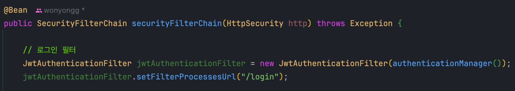 - SecurityFilterChain에 JwtAuthenticationFilter의 인스턴스를 생성하여 url 엔드포인트를 등록하고 파라미터로 authenticationManager()를 넘깁니다.