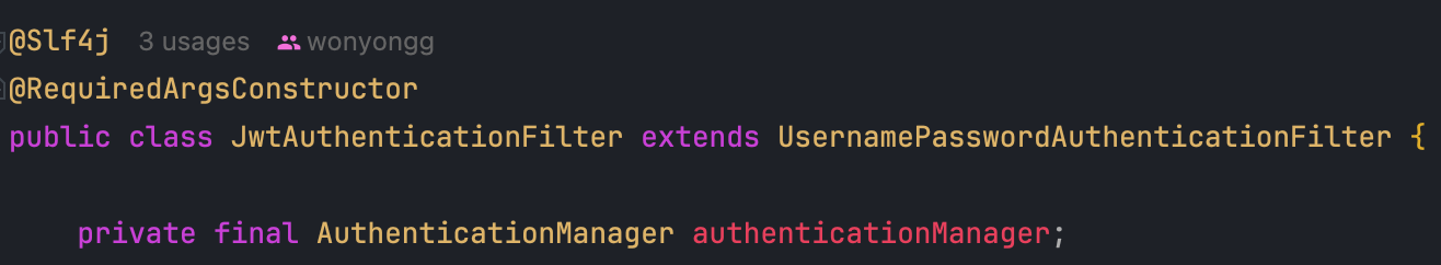 - 그래서 위와 같이 AuthenticationManager를 의존성 주입받아 역할 수행을 대신하도록 하는 것입니다.