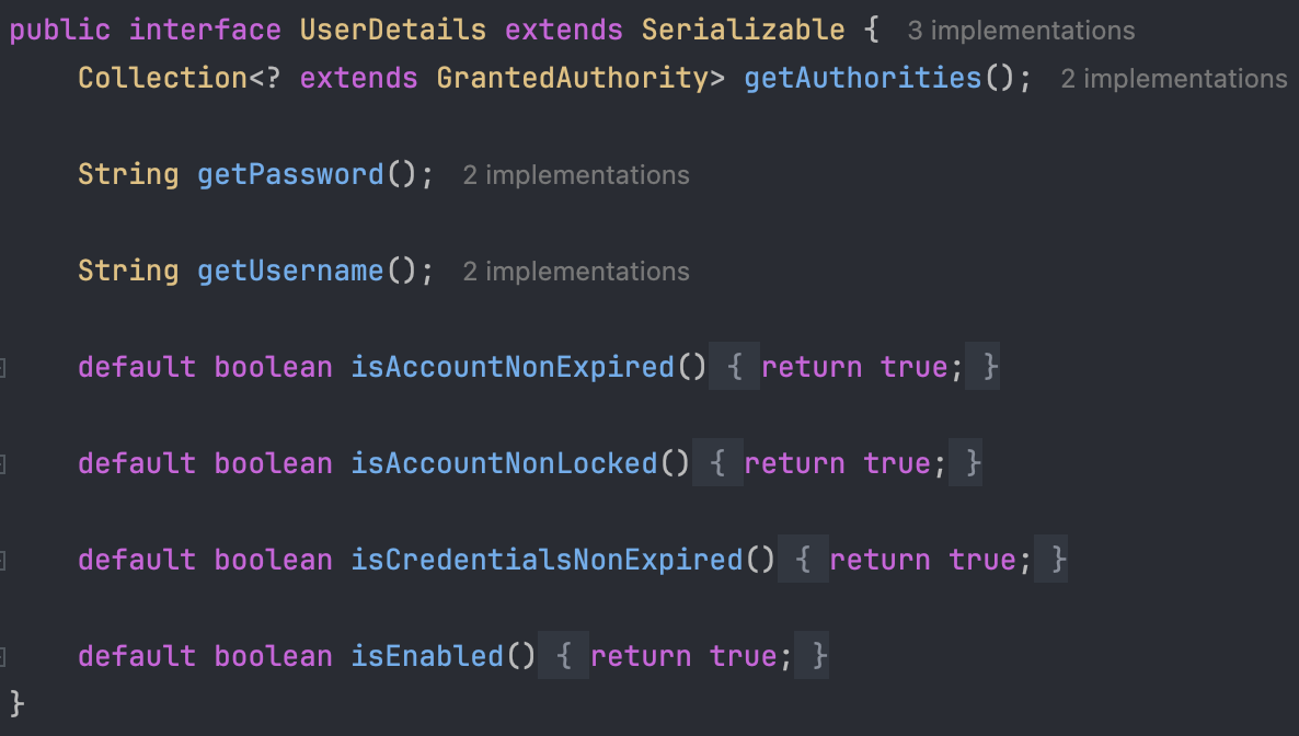 - 이제 UserDetailsService와 UserDetails 인터페이스를 살펴봅시다.