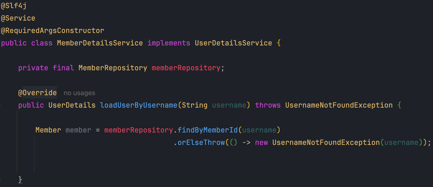 - 이제 DaoAuthenticationProvider가 MemberDetailsService에게 사용자가 로그인 시 입력한 username(id)를 건네줄 테니 데이터베이스에서 해당 유저 정보를 찾아 내가 비교할 수 있게 UserDetails의 구현체에 옮기고 리턴하라고 명령하기 위한 준비가 끝났습니다.