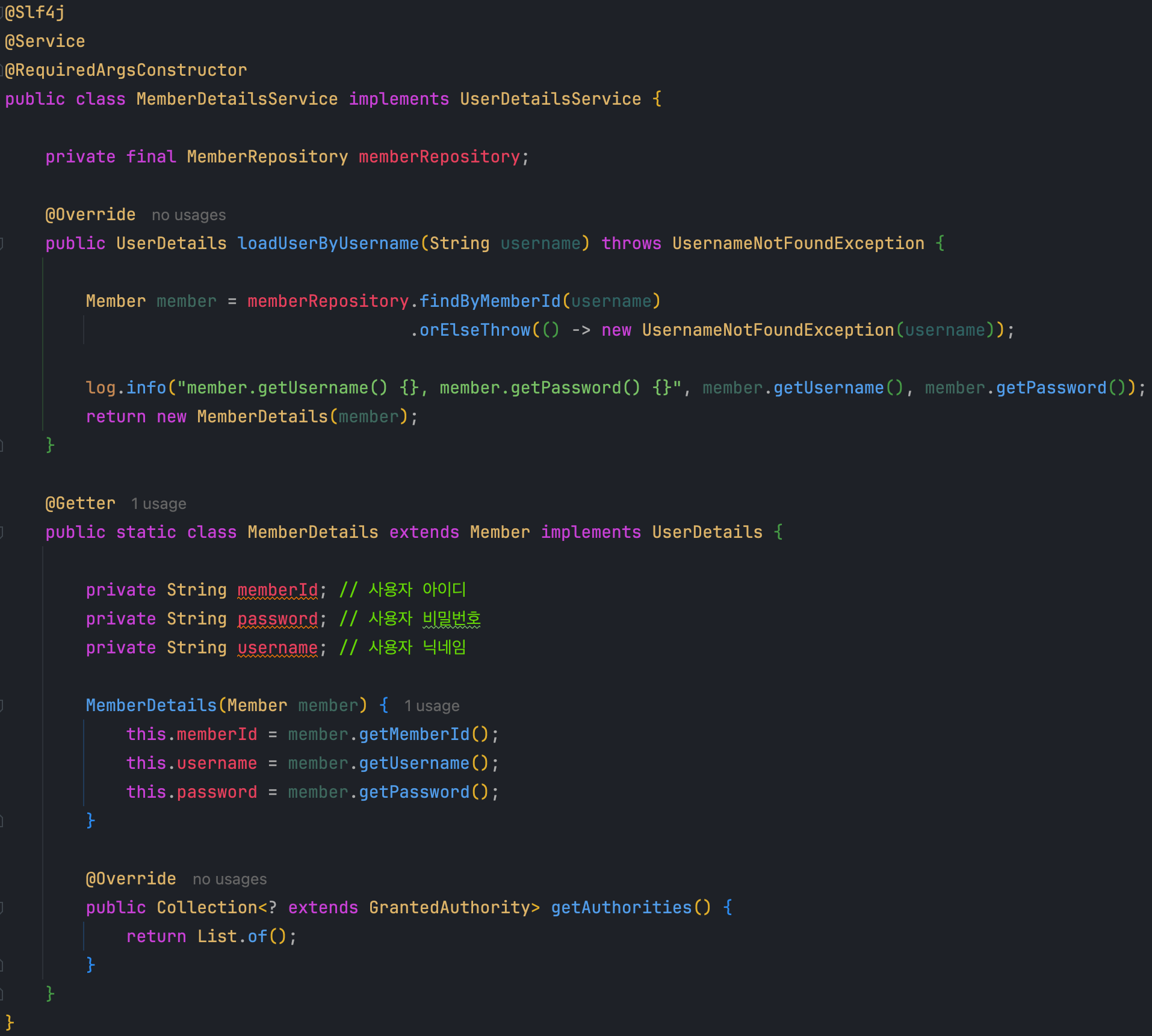 - MemberDetails라는 클래스는 지금도 그렇지만 앞으로도 사용하는 곳이 MemberDetailsService에서 리턴할 때뿐입니다.