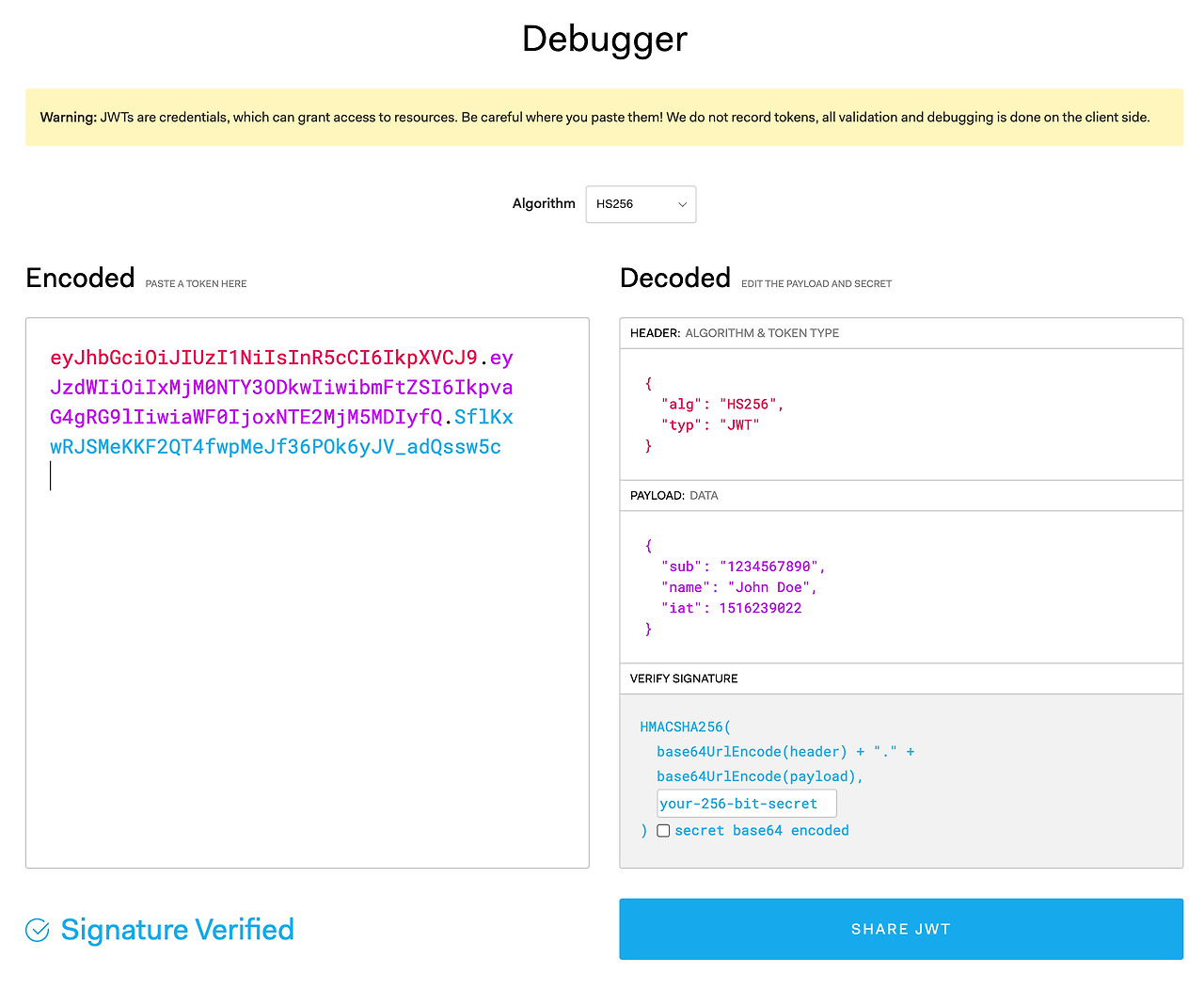 디코딩을 하게 되면 의미없는 스트링 값을 원래의 json 형태 문자열 값으로 변환할 수 있게 되는데 그 안에는 유효 시간, 해시 알고리즘, 유저 정보 등이 들어있습니다. 이 정보를 가지고 사용자의 권한이나 토큰의 유효 시간 등을 판별하게 됩니다. JWT는 특정 키 등으로 암호화한 것이 아니라는 사실을 명심합시다. 누구나 디코딩 가능하기 때문에 보안에 해당하는 정보를 저장해서는 절대 안 됩니다.