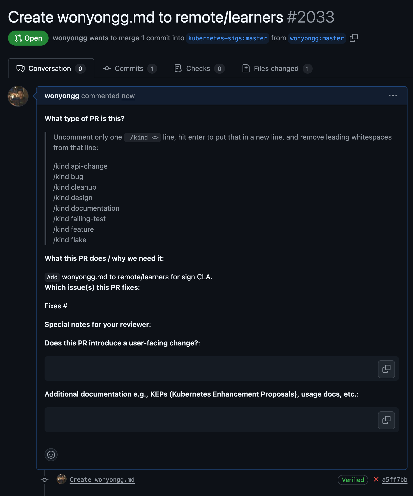 이곳의 remote 디렉터리 내에 자신의 github 아이디를 이름으로 한 마크다운을 생성하고 풀 리퀘스트를 제출하면 위와 같이 동일하게 CLA 서명이 필요하다는 코멘트가 생성됨으로 동일한 방식으로 서명을 진행하면 된다.