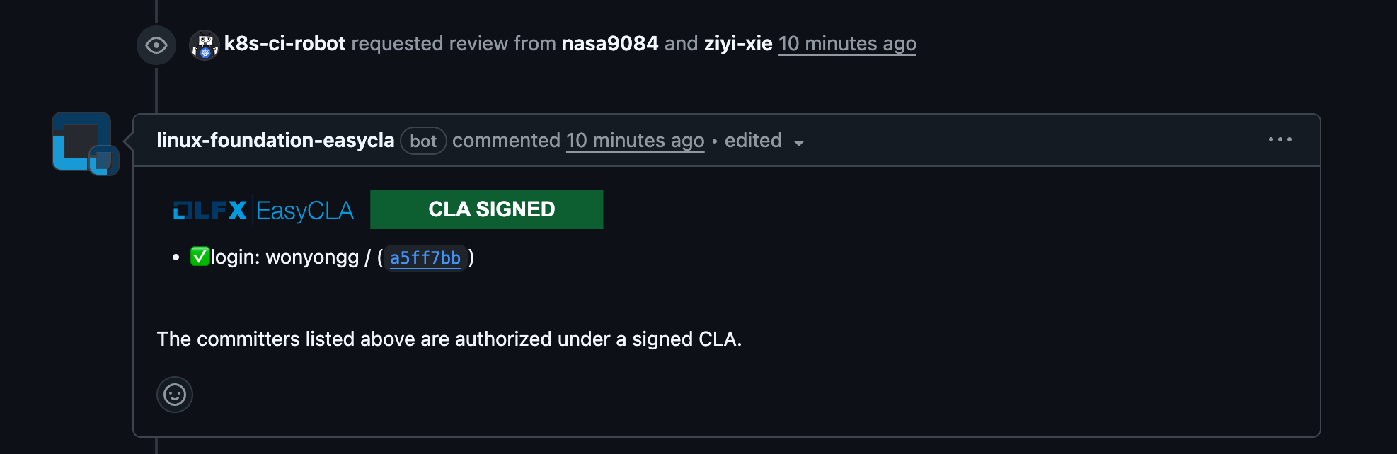 CLA 서명이 완료 후 풀 리퀘스트를 제출하면 위와 같이 코멘트가 생성된다.